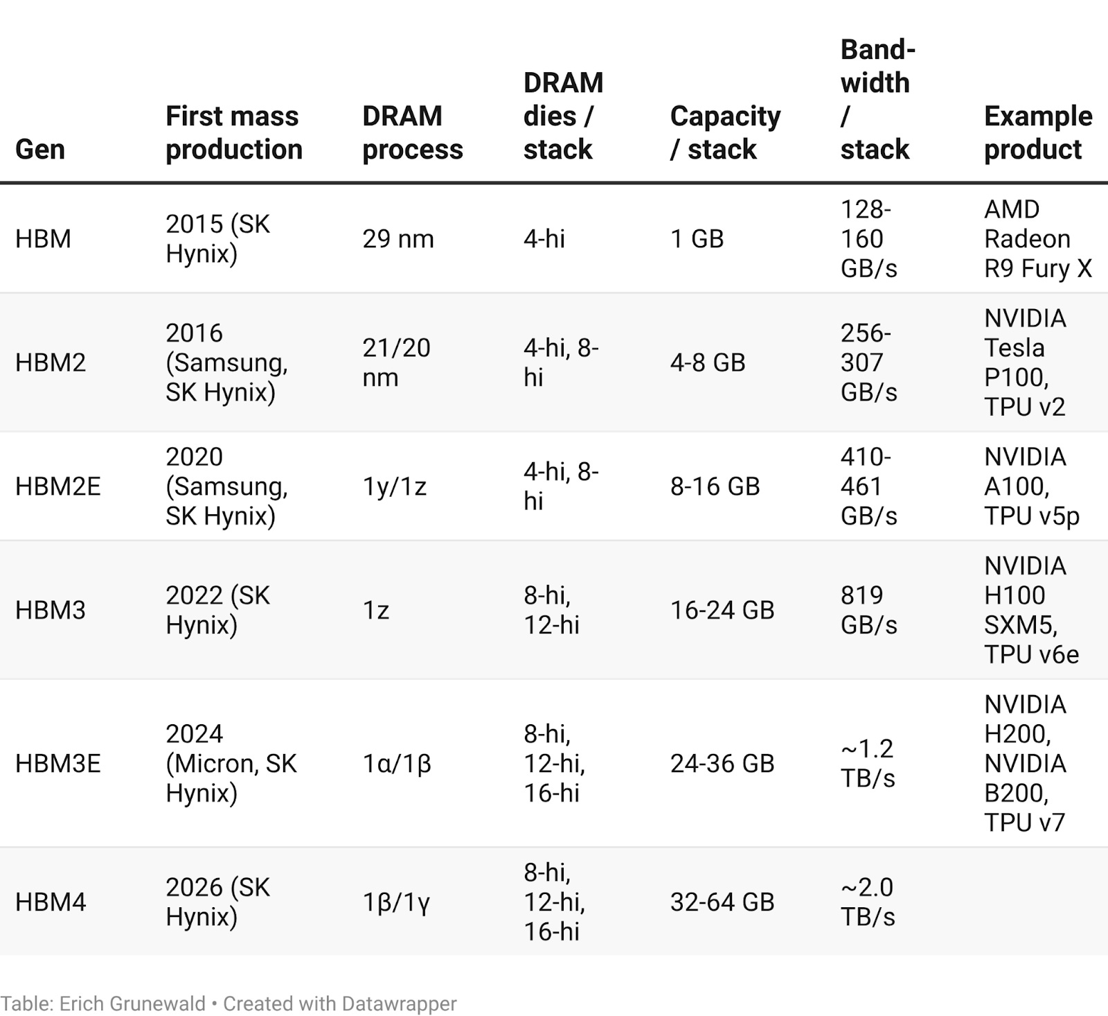 The first product to use HBM was the AMD Fiji GPU, in 2015: a consumer chip mainly used for video gaming. But HBM soon started appearing in data center GPUs and other AI chips, first with Nvidia’s Tesla P100, announced in April 2016. As AI models grew in size and complexity through the late 2010s and into the 2020s, HBM became effectively mandatory for high-performance AI accelerators. And as time went on, each successive generation of HBM provided AI chips with greater memory bandwidth and more memory capacity. In 2024, Nvidia announced its Blackwell architecture, which coupled each data center GPU with multiple HBM stacks.